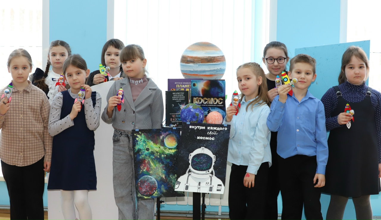 🔹 Сначала ребята приняли участие в интерактивной викторине о космосе. Школьники отвечали на вопросы о планетах, звёздах, первом космонавте Юрии Гагарине и его легендарном полёте. Дети показали отличные знания!